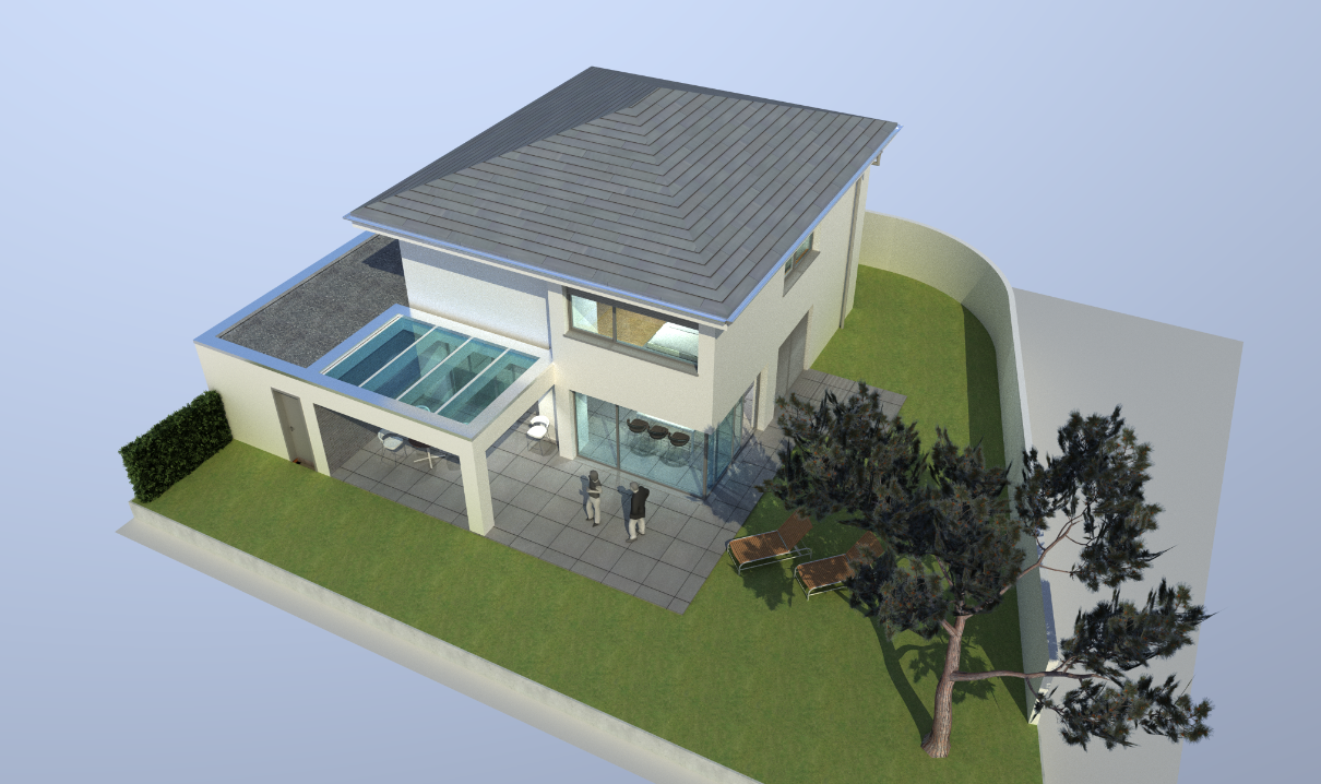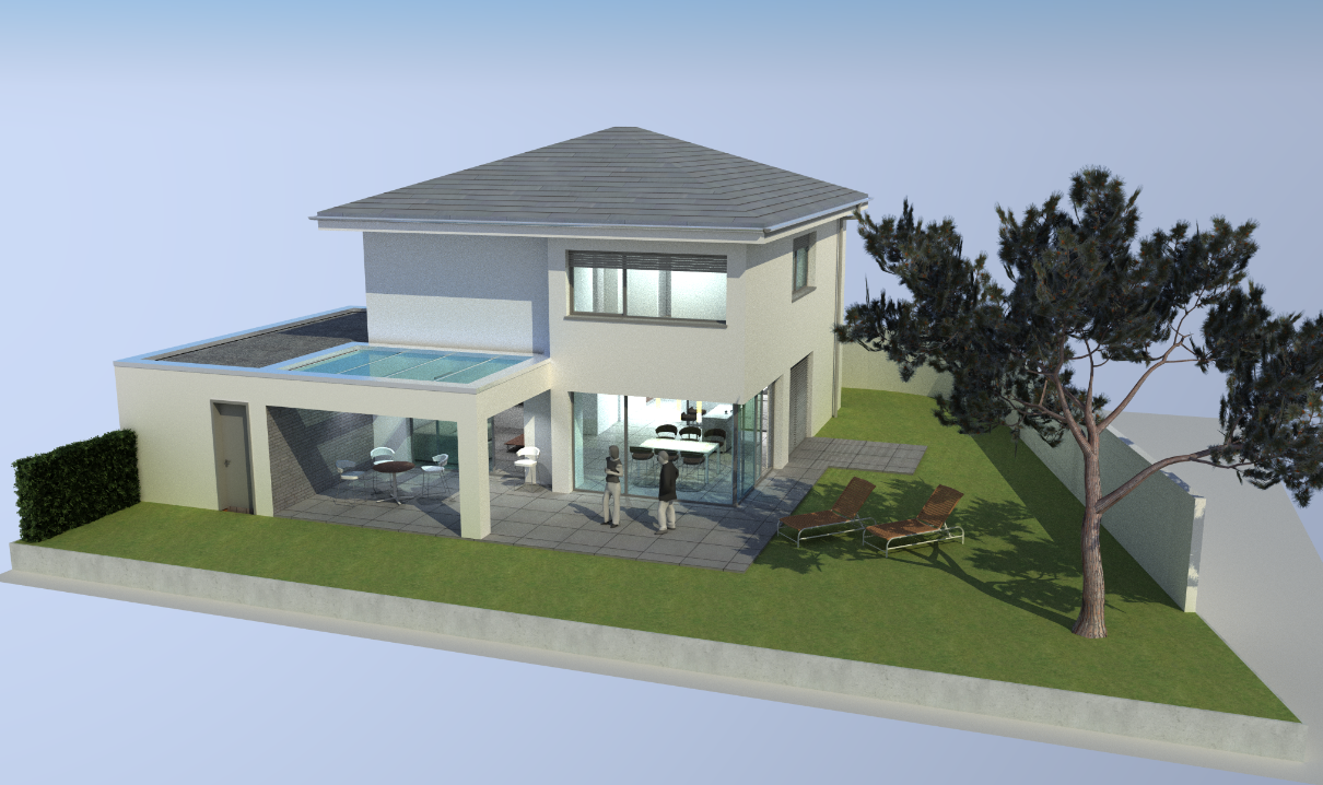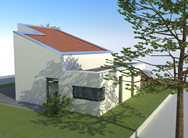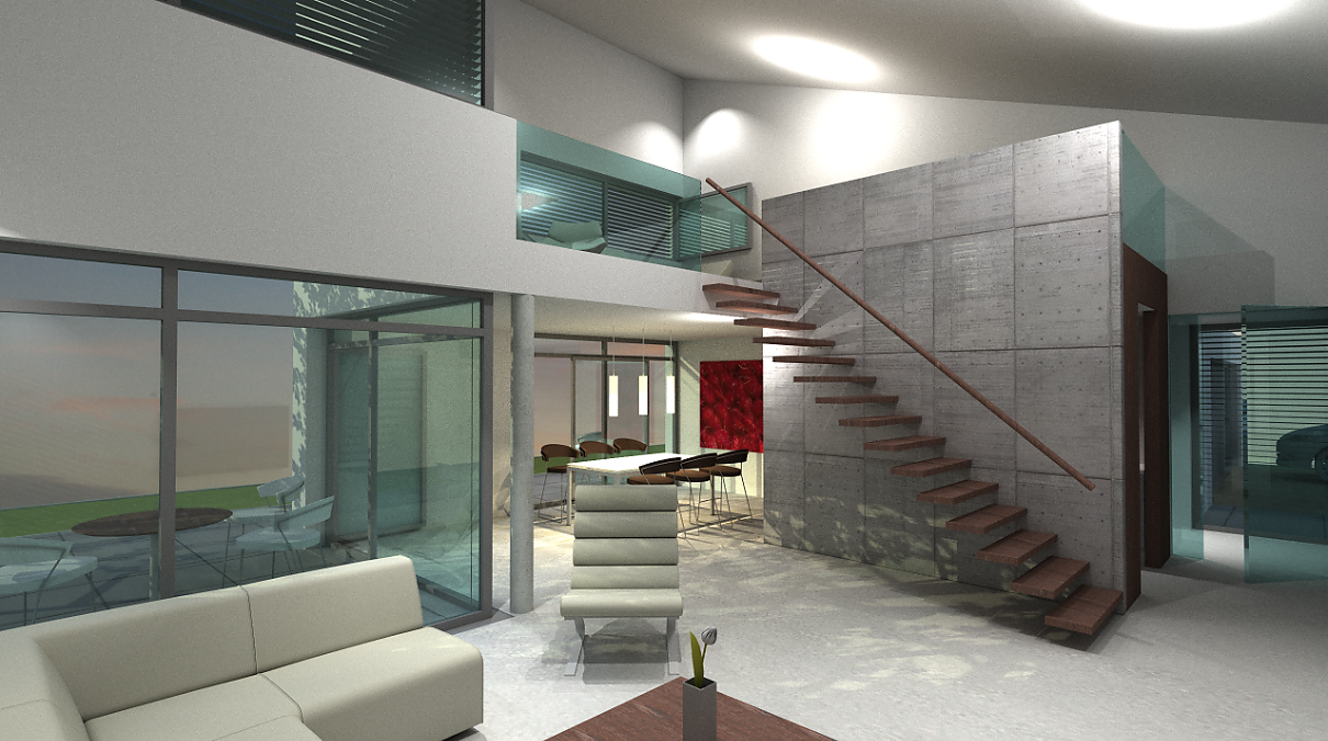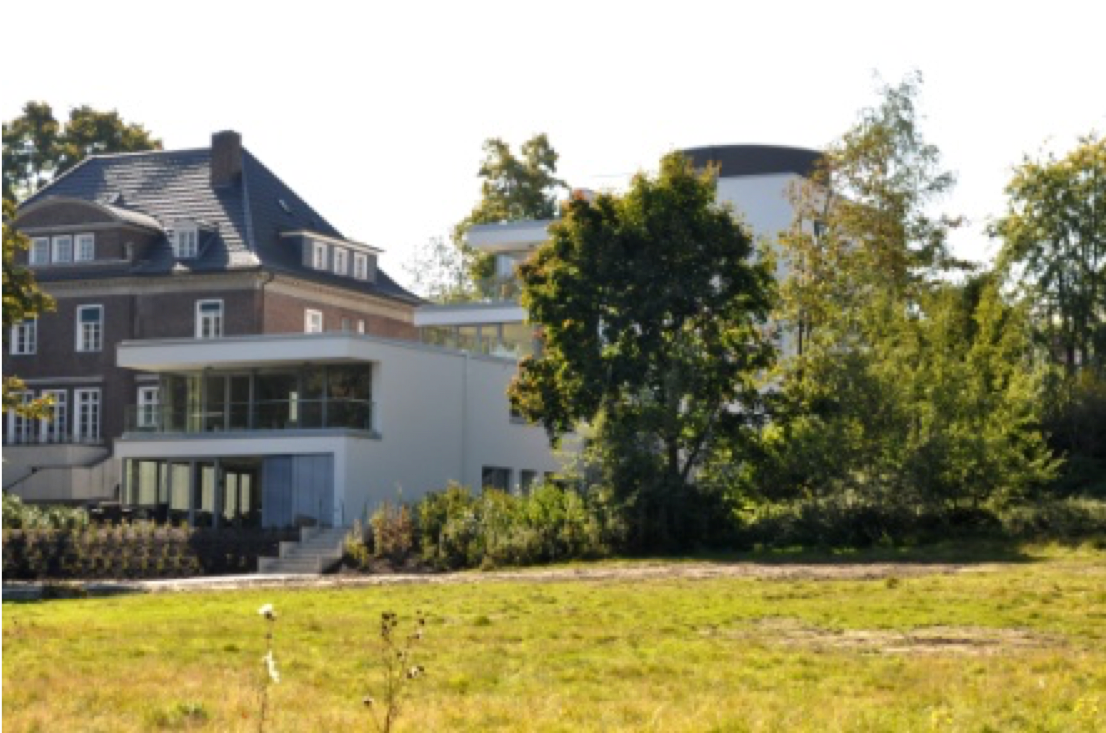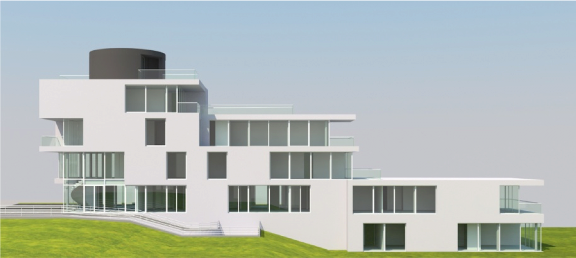 Die prominente Lage an der Ems bietet ein starkes Grundstücksgefälle zur Flussaue. Die Topografie nutzend, erscheint das Gebäude von der Erschließungsebene als eingeschossiger Kubus. Dieser wird von den darunter liegenden, in den Hang gearbeiteten Ebenen getragen, und überkragt diese in einer spannungsvollen Geste.