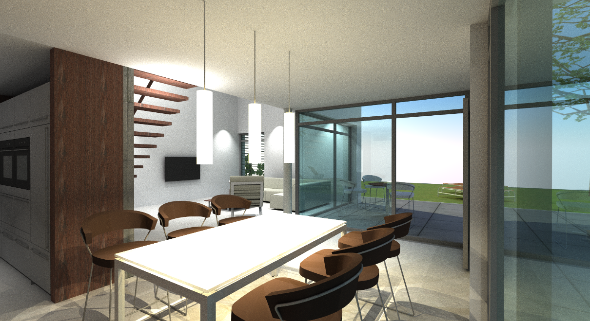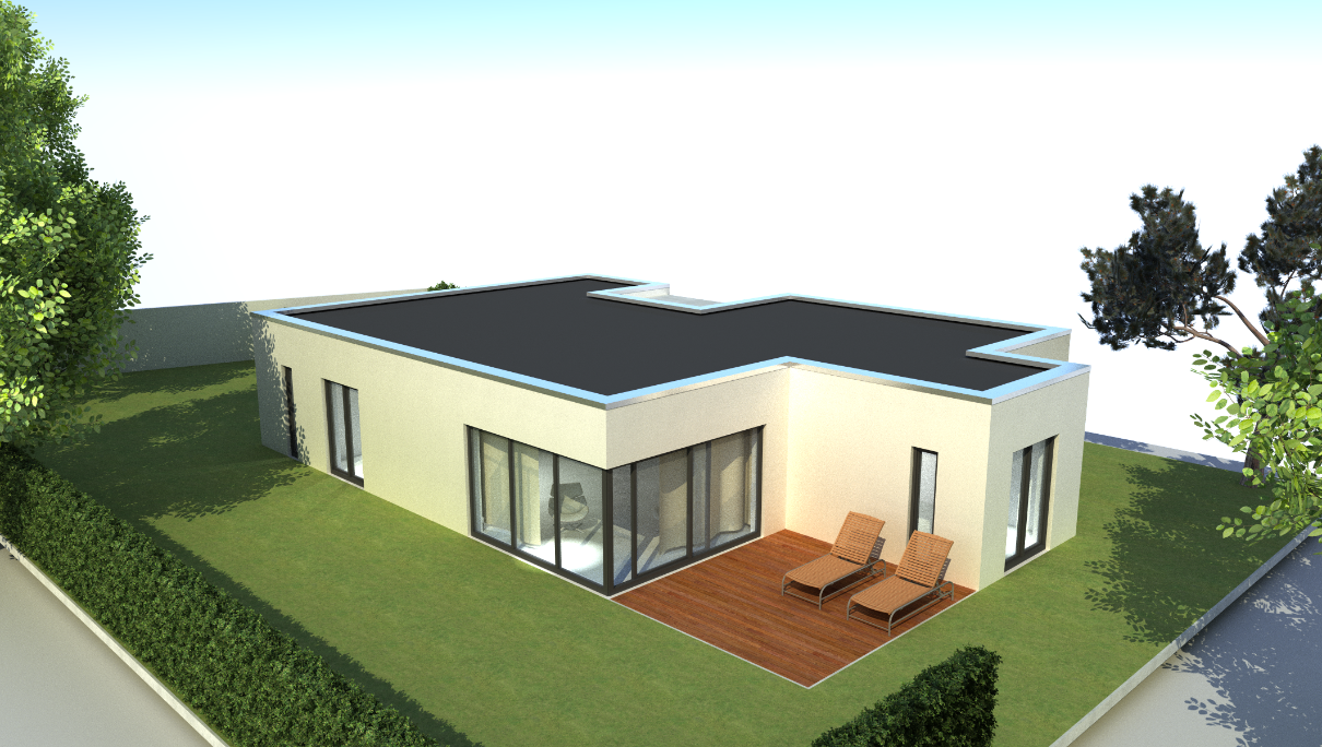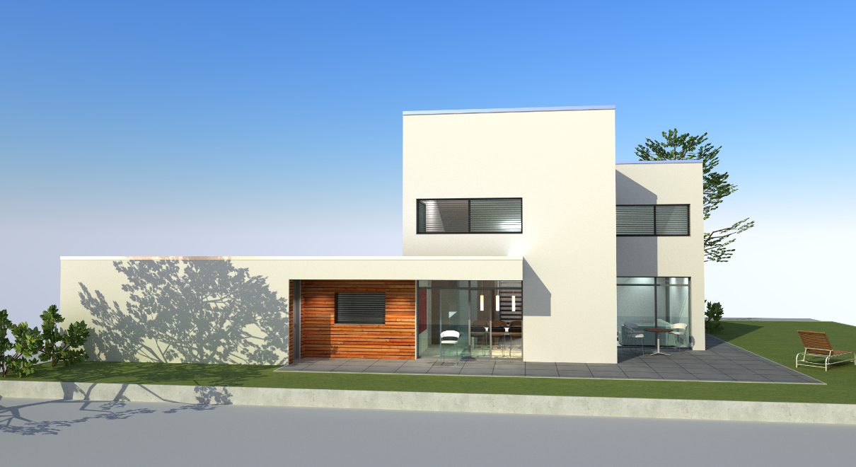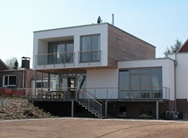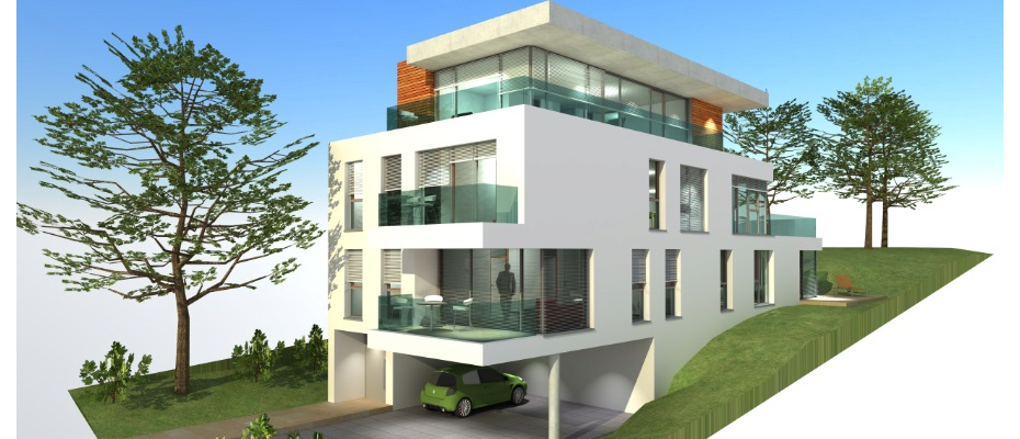 Vom Fluss aus betrachtet, erscheint ein 3 geschossiger Gebäudekörper. Dieser bietet den Bewohnern spektakuläre Aussichtspunkte in die naturbelassene Aue.