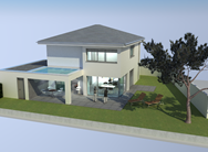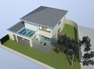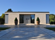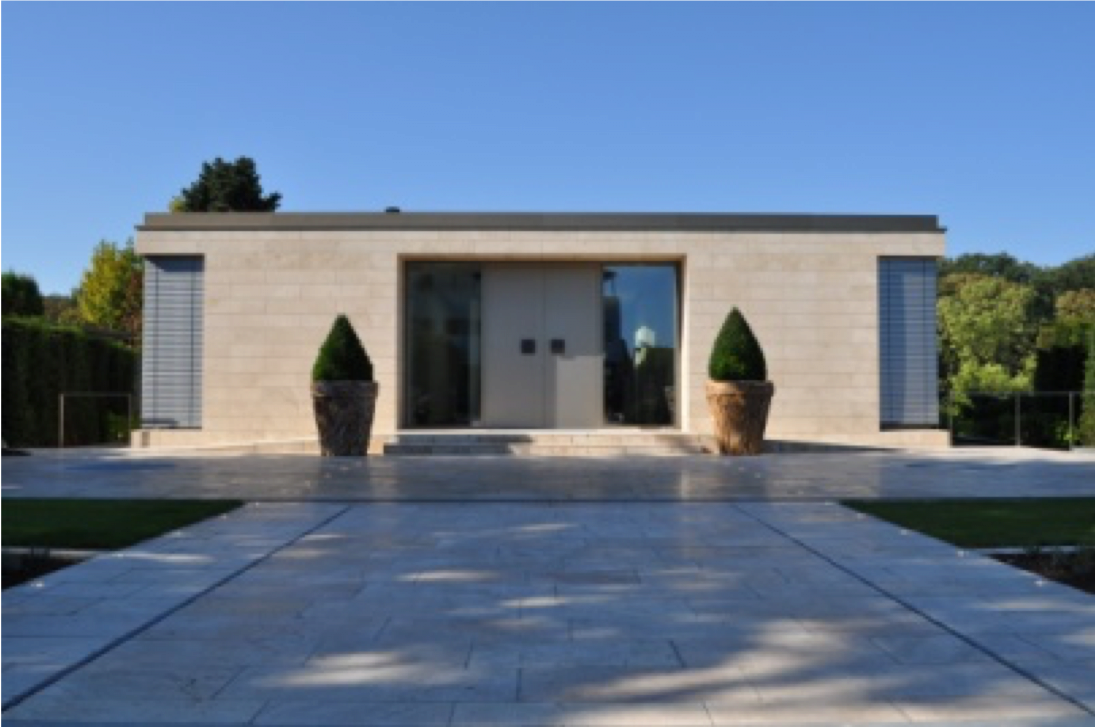Die in den Hang gearbeiteten Gebäudeteile wurden mit grünem, Anröchter Dolomit bekleidet, der auskragende Baukörper mit leichter wirkendem, toskanischem Travertin. Dazu wurden die Fenster bronzefarben eloxiert. Alle Materialien kennzeichnen sich durch die naturbelassene Farbgebung.
